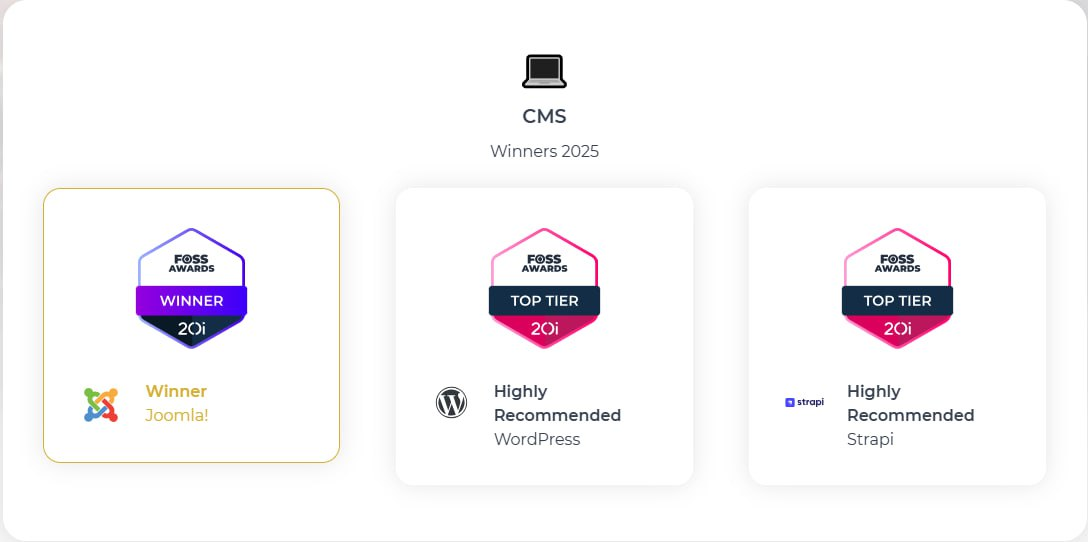 Joomla признана лучшей CMS 2025 в конкурсе 20i FOSS Awards.
