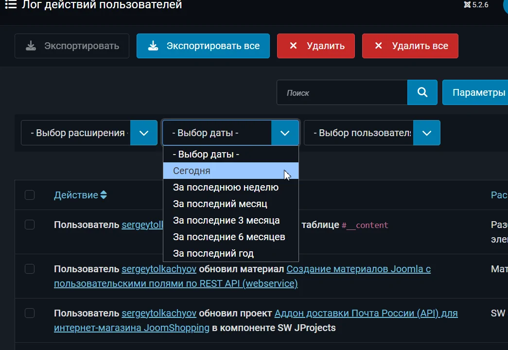 Также есть возможность отфильтровать действия по конкретному пользователю и за выбранный период времени. К сожалению, периоды времени пока что не настраиваются и доступны только предустановленные значения.
