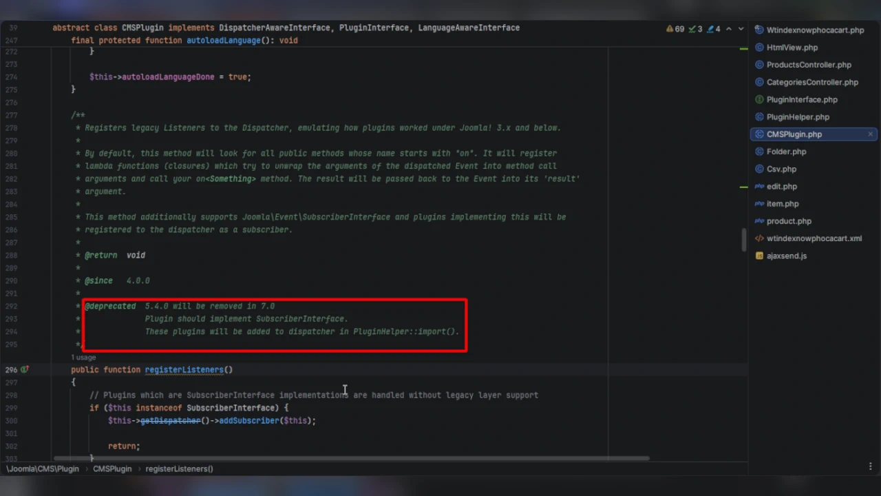 Этот метод регистрирует устаревшие слушатели событий в диспетчере, имитируя работу плагинов Joomla! 3.x и ниже для Joomla 4+. По умолчанию этот метод ищет все общедоступные методы, название которых начинается с on. Он регистрирует лямбда-функции (замыкания), которые пытаются преобразовать аргументы отправленного события в аргументы вызова метода и вызвать ваш метод on<Нечто>. Результат передаётся обратно событию в его аргумент result.