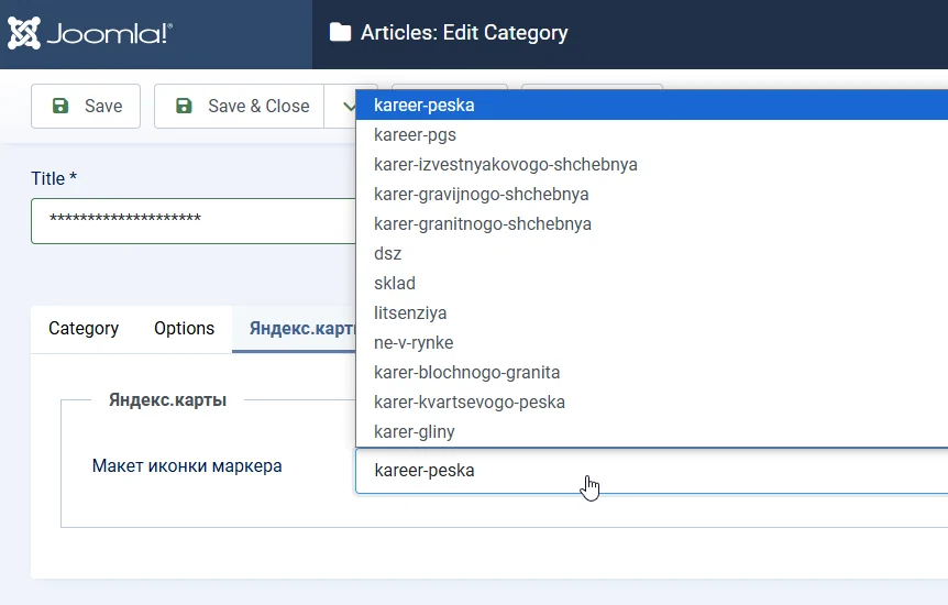 You can specify special layouts for each Joomla article, thereby highlighting them among other labels on the Yandex.map. To do this, create a field where you will specify the path to the layout, but for the article. In the module settings, select the created field as the source of the path to the map marker layout for the article.
